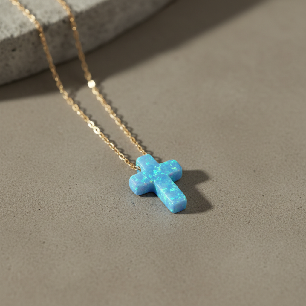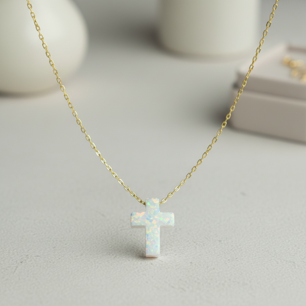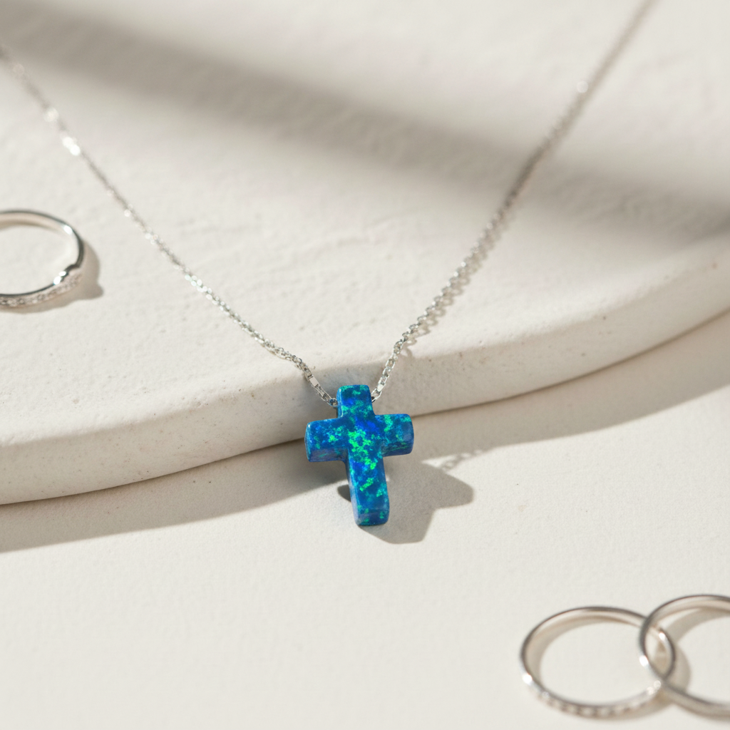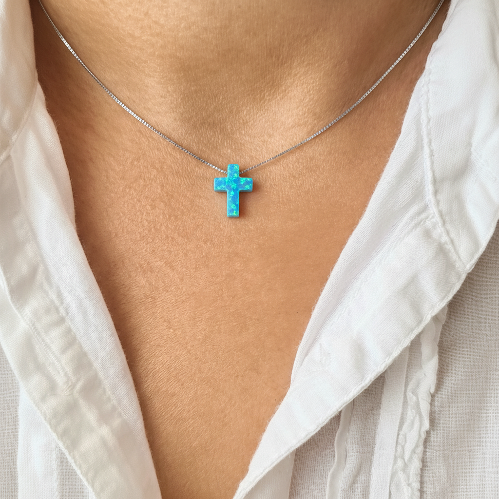 Cruz de ópalo con brillos únicos en cadena fina de acero o plata 925.