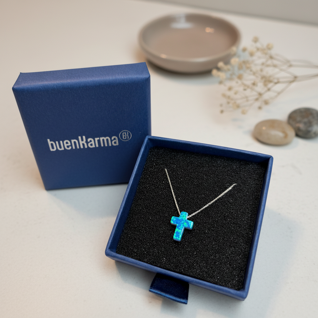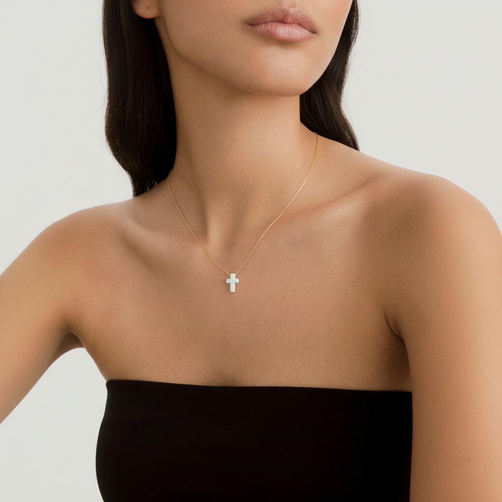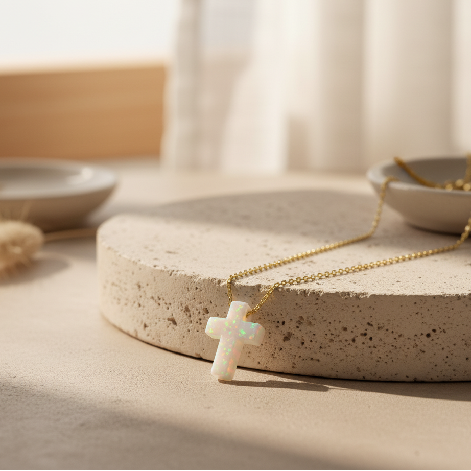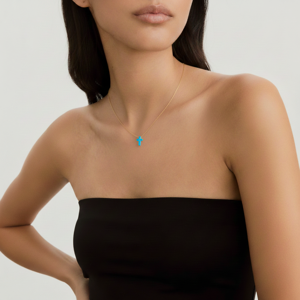 Cruz de ópalo con brillos únicos en cadena fina de acero o plata 925.